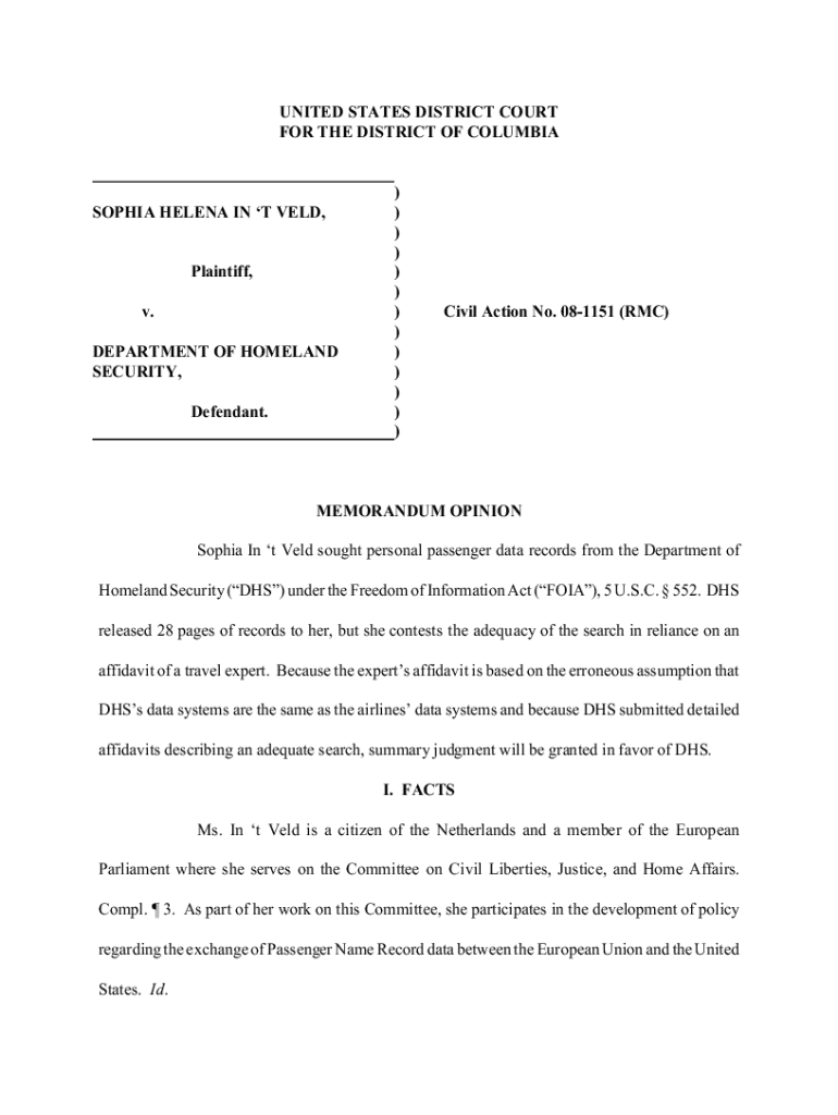 UNITED STATES DISTRICT COURT FOR THE DISTRICT OF COLUMBIASOPHIA HELENA IN T VELD,Plaintiff, v. DEPARTMENT OF HOMELAND SECURITY, Defendant.) ) ) ) ) ) ) ) ) ) ) ) )Civil Action No. 081151 (RMC)MEMORANDUM