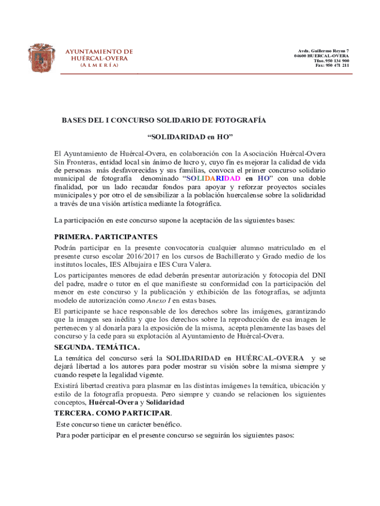 Avda. Guillermo Reyna 7 04600 HUERCALOVERA Tfno. 950 134 900 Fax: 950 471 211AYUNTAMIENTO DE HURCALOVERA (A l m e r a)BASES DEL I CONCURSO SOLIDARIO DE FOTOGRAFA SOLIDARIDAD en HO El Ayuntamiento