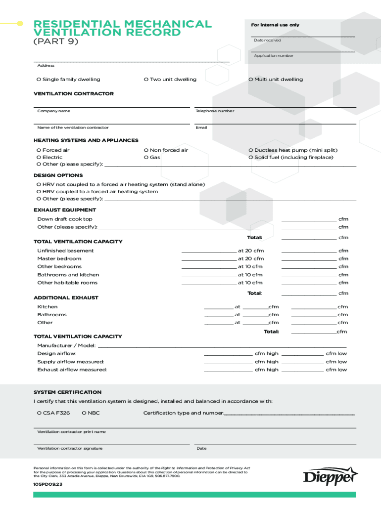 RESIDENTIAL MECHANICAL VENTILATION RECORDFor internal use only(PART 9)Date receivedApplication number AddressO Single family dwellingO Two unit dwellingO Multi unit dwellingVENTILATION CONTRACTORCompany