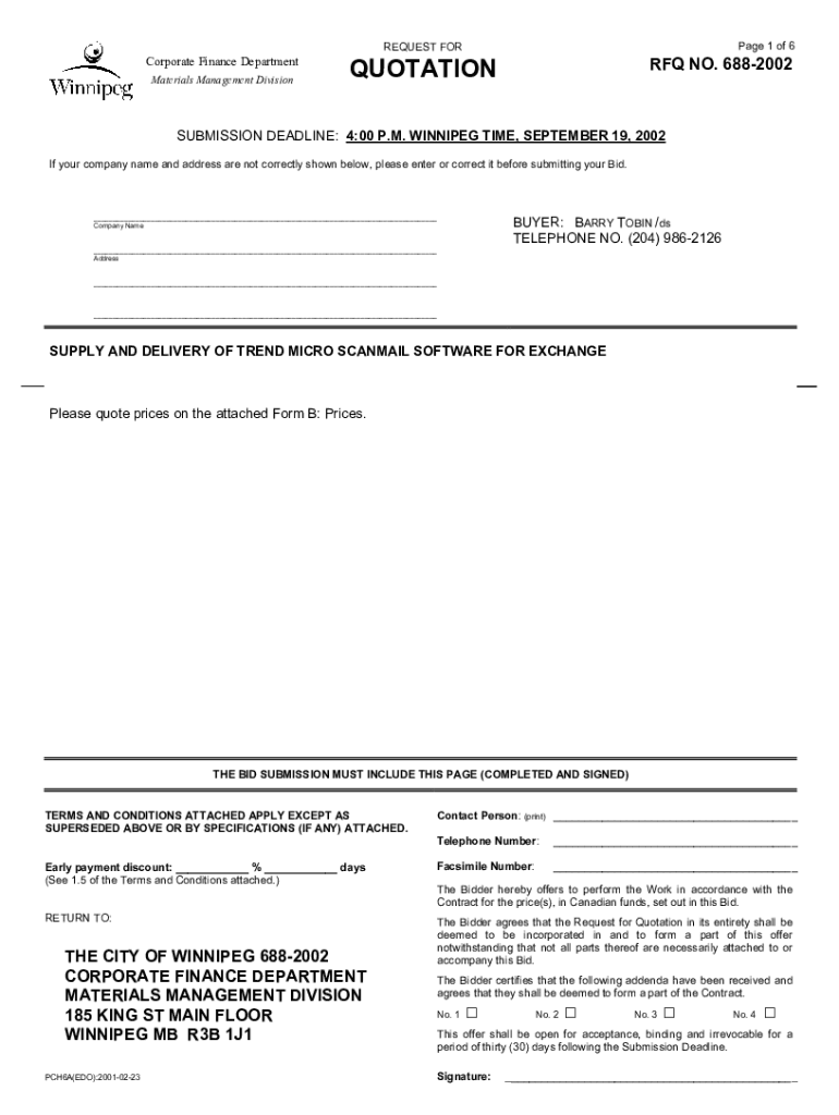 Materials Management Division NO. 6882002QUOTATIONSUBMISSION DEADLINE: 4:00 P.M. WINNIPEG TIME, SEPTEMBER 19, 2002,