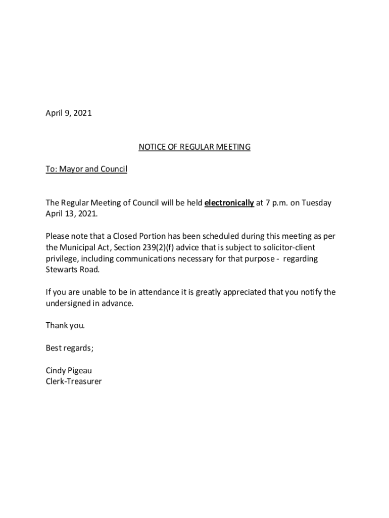April 9, 2021 NOTICE OF REGULAR MEETING To: Mayor and Council The Regular Meeting of Council will be held electronically at 7 p.m. on Tuesday April 13, 2021. Please note that a Closed Portion has