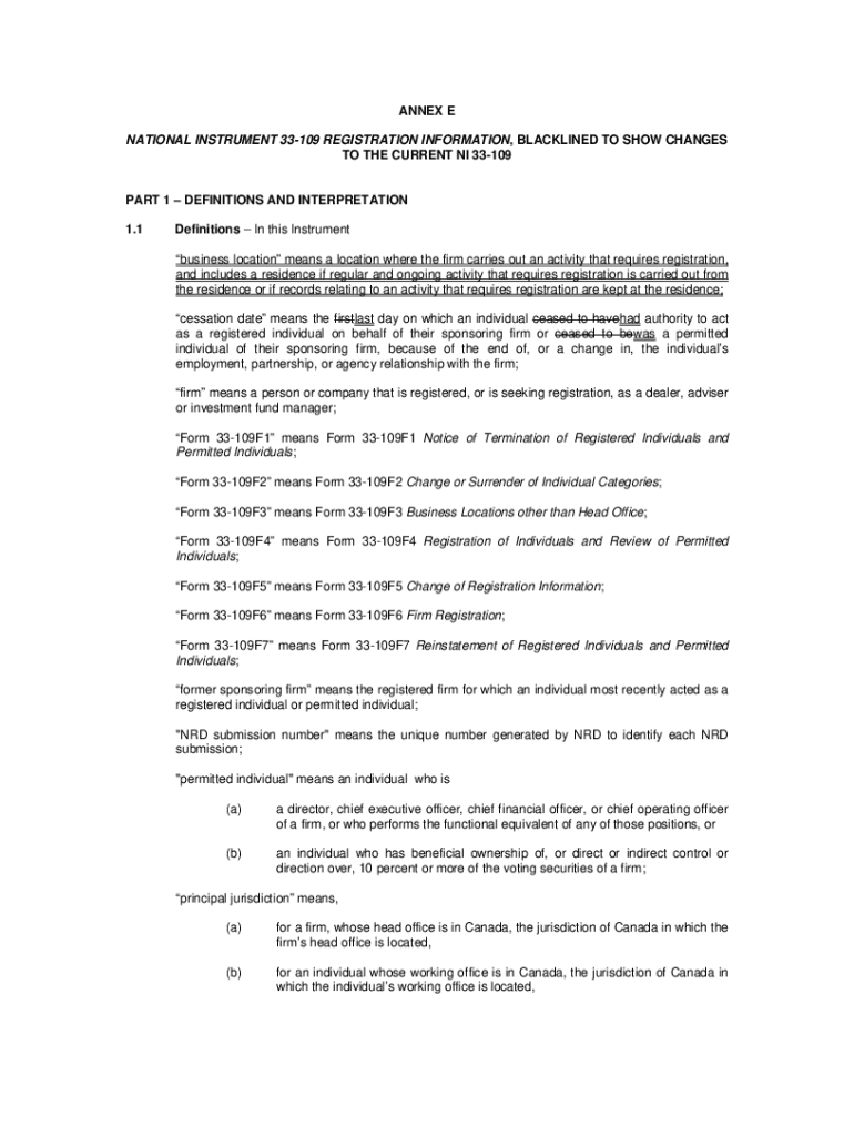 ANNEX E NATIONAL INSTRUMENT 33109 REGISTRATION INFORMATION, BLACKLINED TO SHOW CHANGES TO THE CURRENT NI 33109PART 1 DEFINITIONS AND INTERPRETATION 1.1Definitions In this Instrument business location
