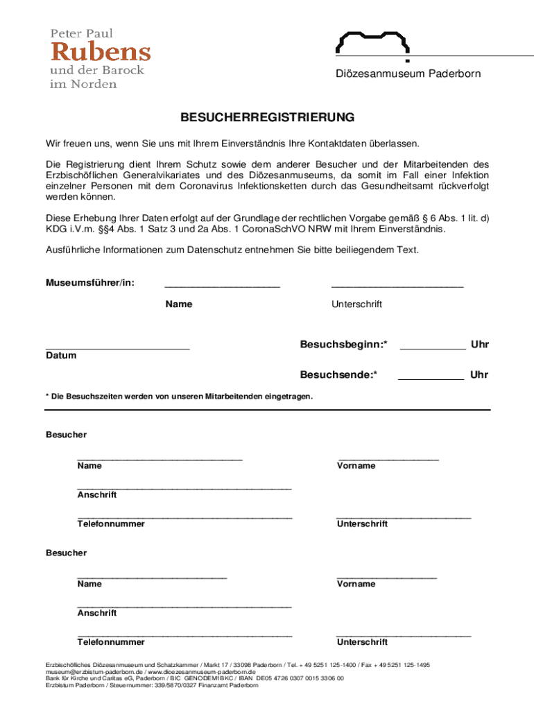 Dizesanmuseum PaderbornBESUCHERREGISTRIERUNG Wir freuen uns, wenn Sie uns mit Ihrem Einverstndnis Ihre Kontaktdaten berlassen. Die Registrierung dient Ihrem Schutz sowie dem anderer Besucher und der