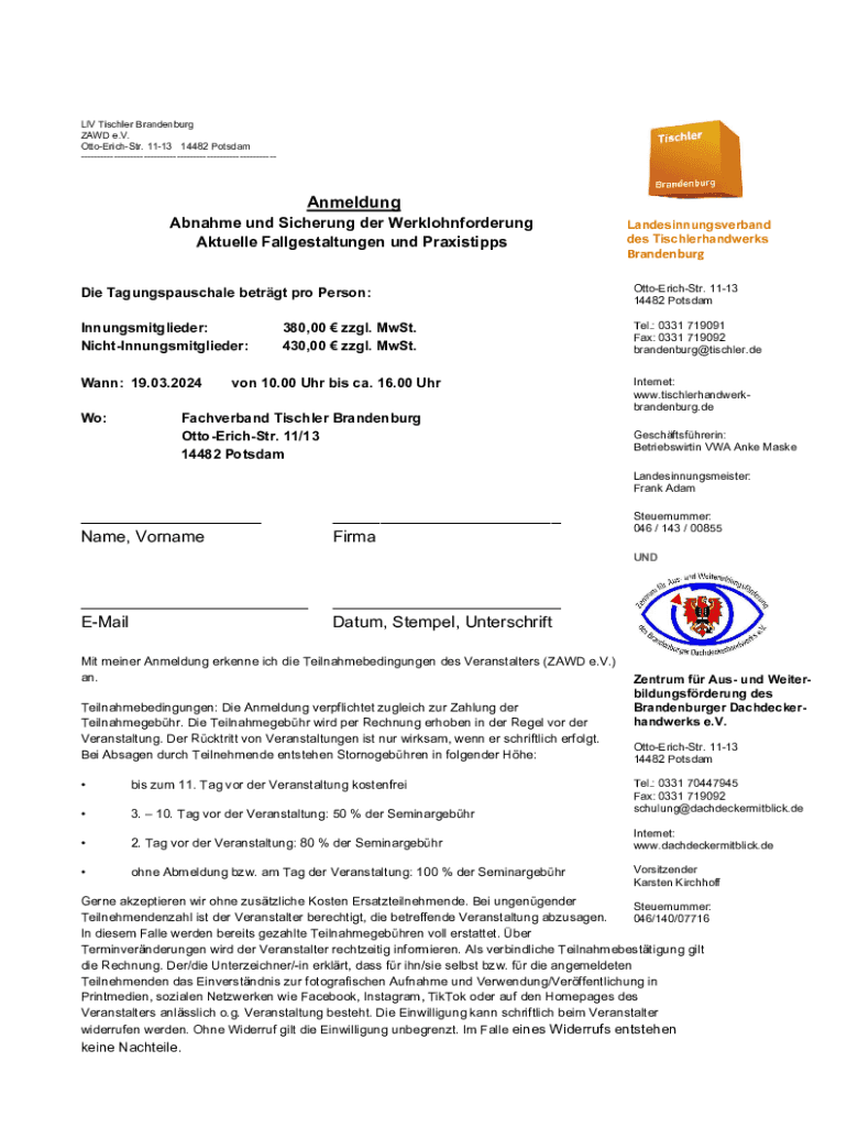 LIV Tischler Brandenburg ZAWD e.V. OttoErichStr. 1113 14482 Potsdam Anmeldung Abnahme und Sicherung der Werklohnforderung Aktuelle Fallgestaltungen und PraxistippsLandesinnungsverband des TischlerhandwerksBrandenburgDie