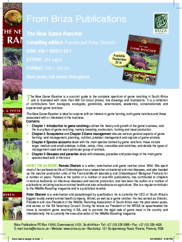 From Briza Publications The New Game Rancher Compiling editors: Pamela and Peter Oberem ISBN: 9781920217327 EXTENT: 384 pagesAvailable September 2016FORMAT: 240 x 168 mm Hard cover, full colour throughoutThe
