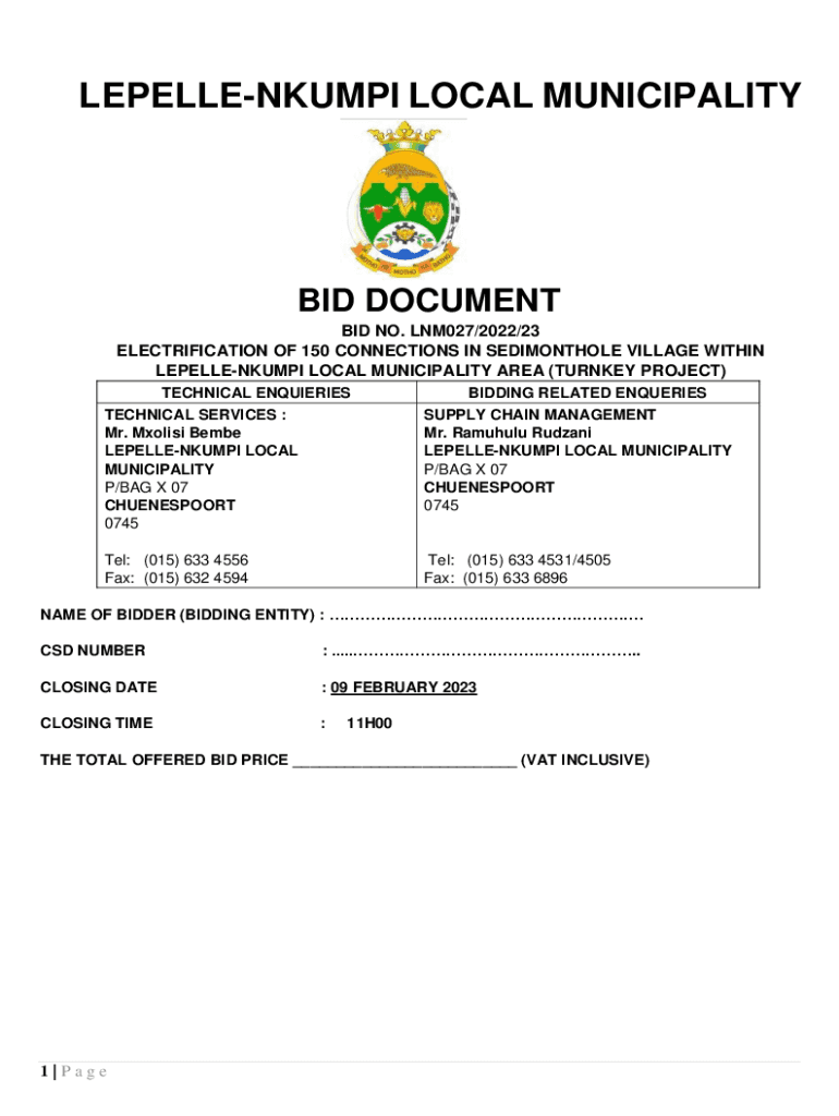 LEPELLENKUMPI LOCAL MUNICIPALITYBID DOCUMENT BID NO. LNM027/2022/23 ELECTRIFICATION OF 150 CONNECTIONS IN SEDIMONTHOLE VILLAGE WITHIN LEPELLENKUMPI LOCAL MUNICIPALITY AREA (TURNKEY PROJECT) TECHNICAL