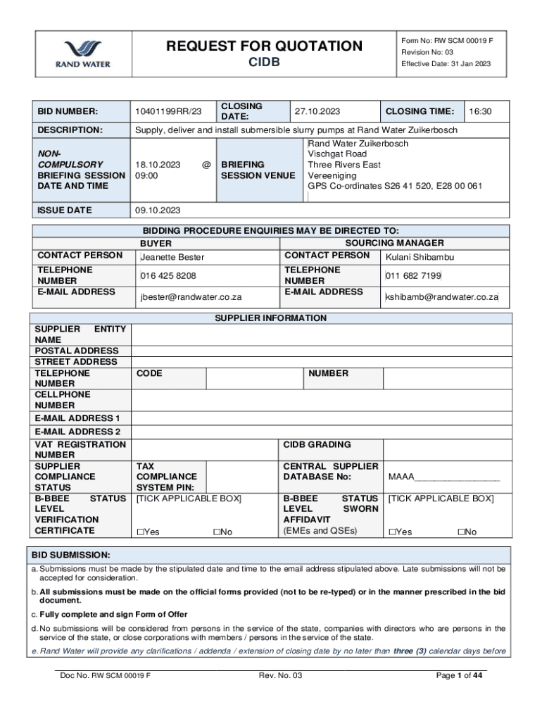 REQUEST FOR QUOTATION CIDBCLOSING DATE:Form No: RW SCM 00019 F Revision No: 03 Effective Date: 31 Jan 2023BID NUMBER:10401199RR/23DESCRIPTION:Supply, deliver and install submersible slurry pumps at