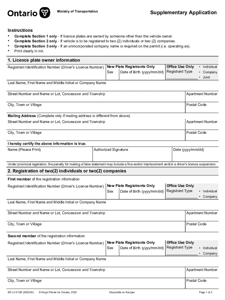 Supplementary ApplicationMinistry of TransportationInstructions Complete Section 1 only If licence plates are owned by someone other than the vehicle owner. Complete Section 2 only If vehicle is to