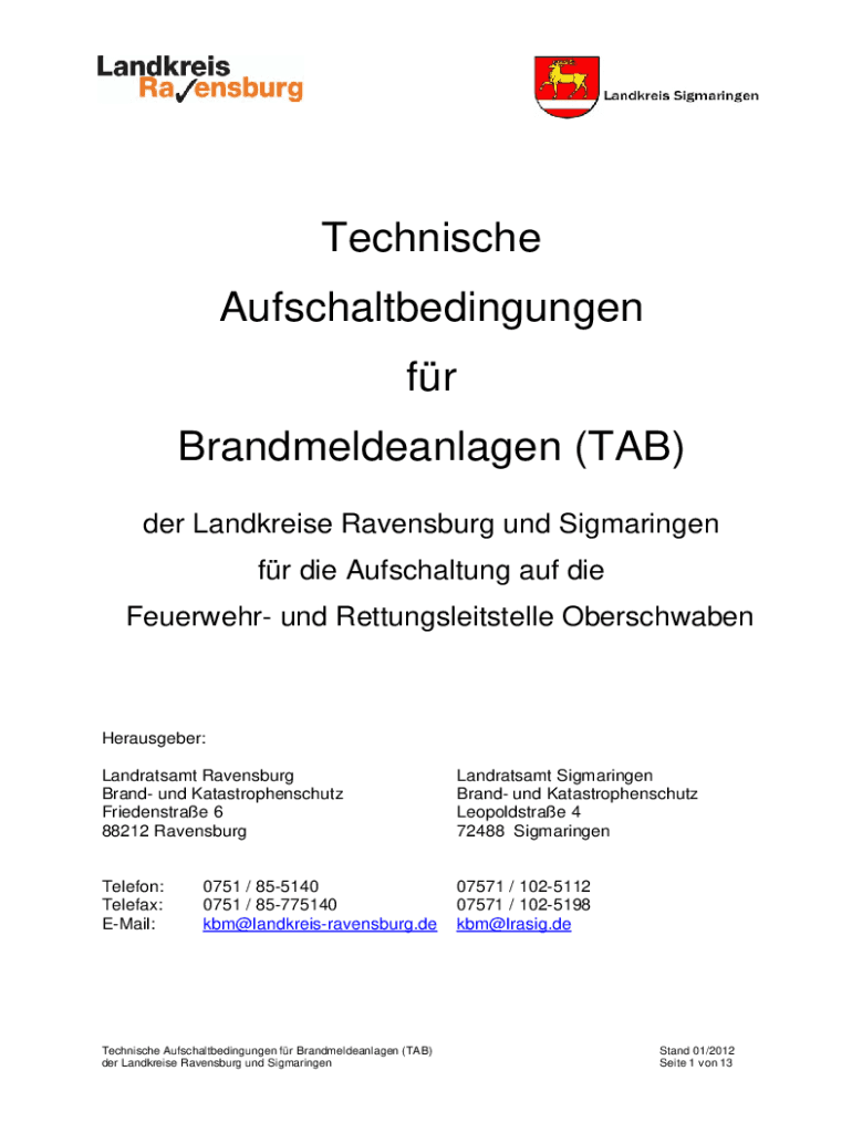 Technische Aufschaltbedingungen fr Brandmeldeanlagen (TAB) der Landkreise Ravensburg und Sigmaringen fr die Aufschaltung auf die Feuerwehr und Rettungsleitstelle OberschwabenHerausgeber: Landratsamt