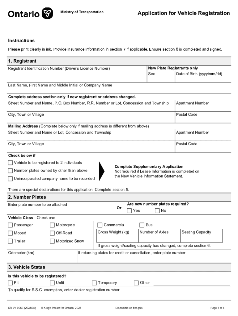Application for Vehicle RegistrationMinistry of TransportationInstructions Please print clearly in ink. Provide insurance information in section 7 if applicable. Ensure section 8 is completed and