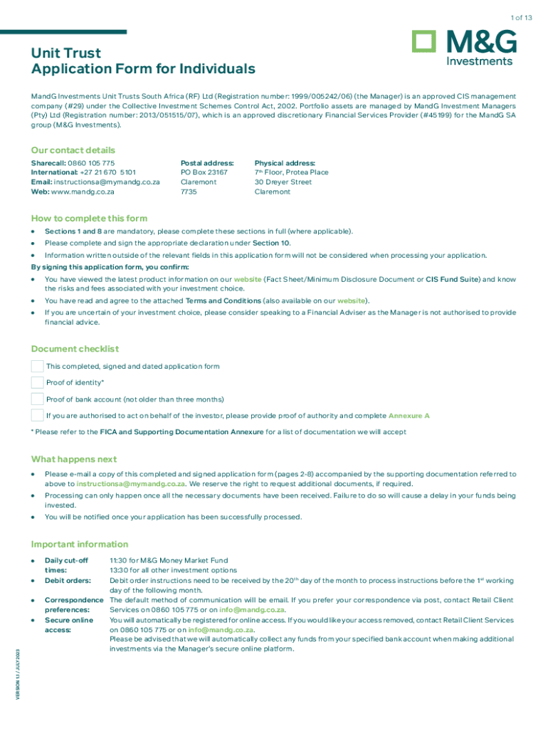 1 of 13Unit Trust Application Form for Individuals MandG Investments Unit Trusts South Africa (RF) Ltd (Registration number: 1999/005242/06) (the Manager) is an approved CIS management company (#29)