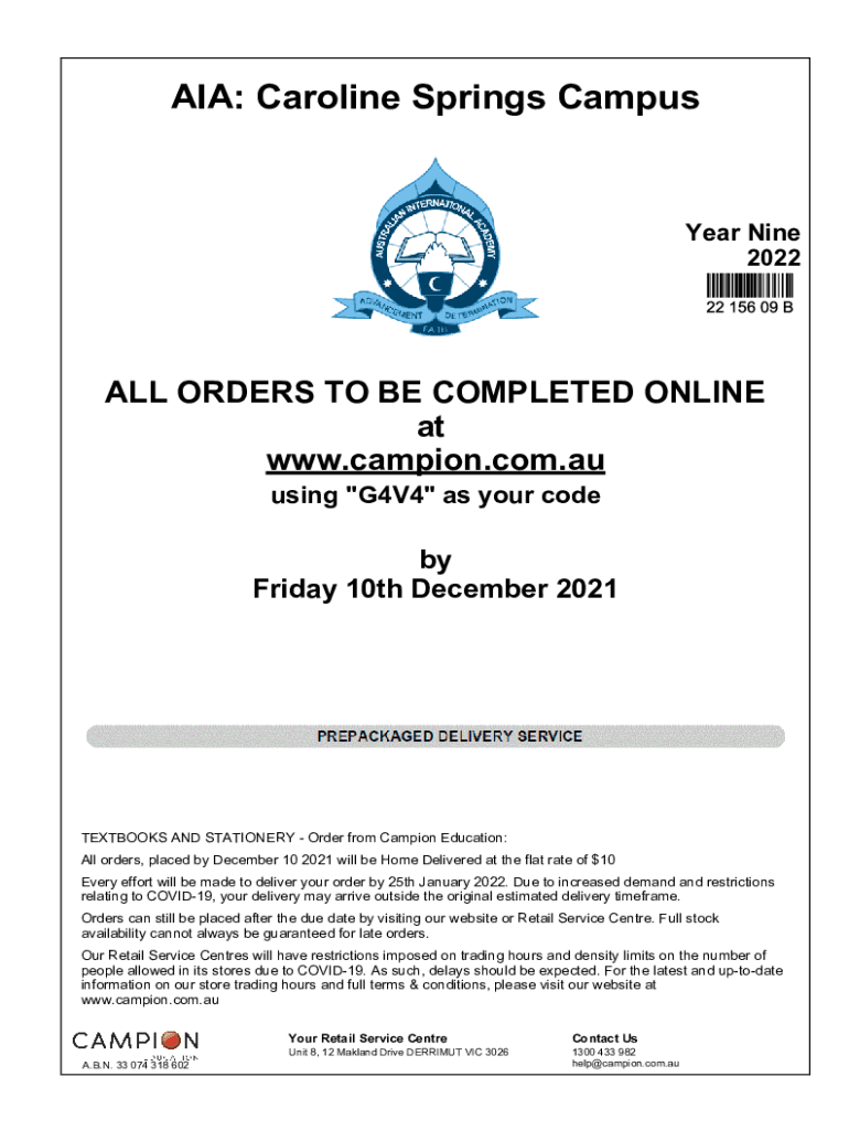AIA: Caroline Springs CampusYear Nine 2022ALL ORDERS TO BE COMPLETED ONLINE at www.campion.com.au using \"G4V4\" as your codeby Friday 10th December 2021TEXTBOOKS AND STATIONERY Order from Campion
