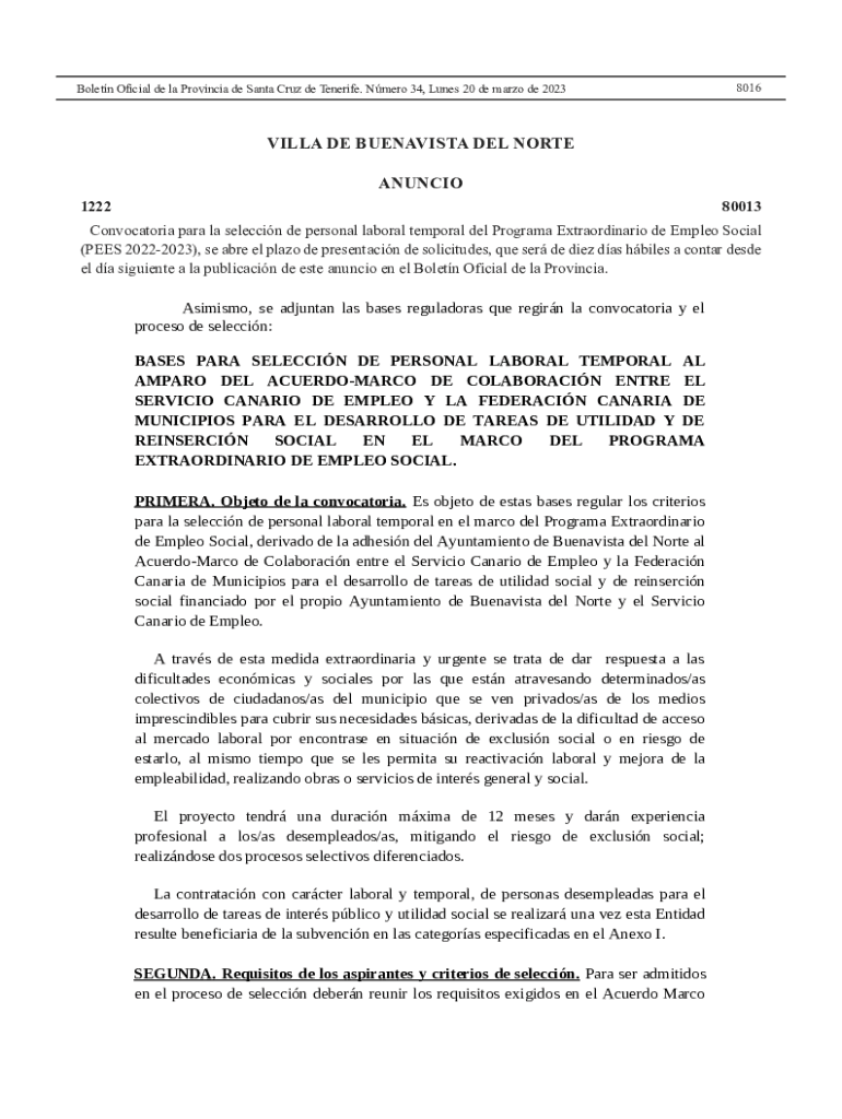 Boletn Oficial de la Provincia de Santa Cruz de Tenerife. Nmero 34, Lunes 20 de marzo de 20238016VILLA DE BUENAVISTA DEL NORTE ANUNCIO ANUNCIO EN EL BOLETN OFICIAL DE LA PROVINCIA 1222 80013 Convocatoria