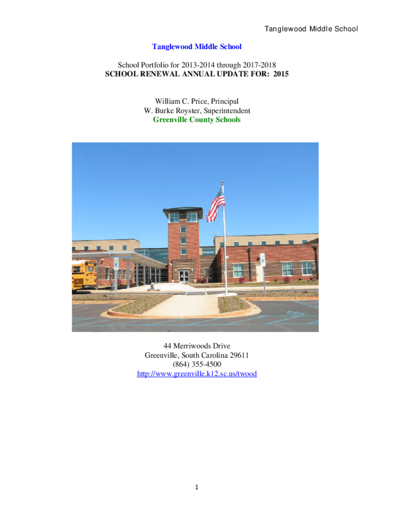 Tanglewood Middle SchoolTanglewood Middle School School Portfolio for 20132014 through 20172018 SCHOOL RENEWAL ANNUAL UPDATE FOR: 2015William C. Price, Principal W. Burke Royster, Superintendent Greenville