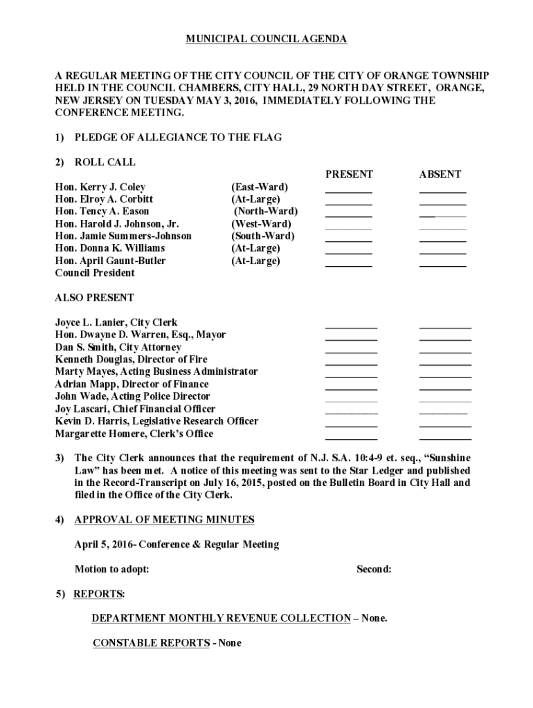 MUNICIPAL COUNCIL AGENDA A REGULAR MEETING OF THE CITY COUNCIL OF THE CITY OF ORANGE TOWNSHIP HELD IN THE COUNCIL CHAMBERS, CITY HALL, 29 NORTH DAY STREET, ORANGE, NEW JERSEY ON TUESDAY MAY 3, 2016,