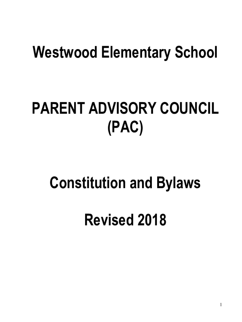 Westwood Elementary School PARENT ADVISORY COUNCIL (PAC) Constitution and Bylaws Revised 20181CONSTITUTION and BYLAWS of the XXX SCHOOL PARENT ADVISORY COUNCILTABLE of CONTENTS SUBJECTPAGESECTION