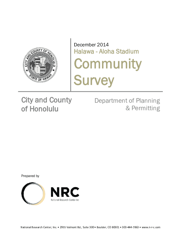 December 2014Halawa Aloha StadiumCity and County of HonoluluCommunity Survey Department of Planning & PermittingPrepared byNationalResearchCenter,Inc.2955ValmontRd.,Suite300Boulder,CO803013034447863www.nrc.comCityandCountyofHonolulu