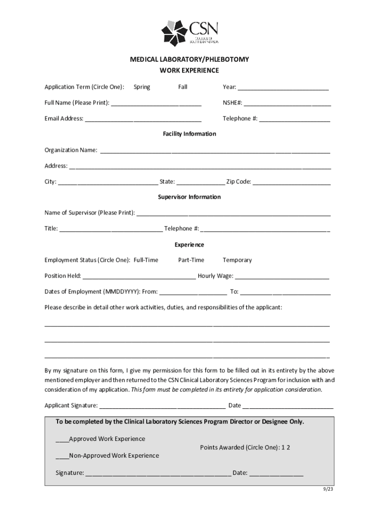 Get the free Medical Laboratory/Phlebotomy Work Experience Form