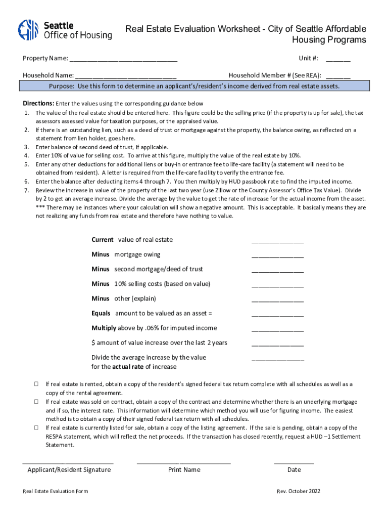 Real Estate Evaluation Worksheet City of Seattle Affordable Housing Programs Property Name: ___Unit #:___Household Member # (See REA): ___ Household Name: ___ Purpose: Use this form to determine an
