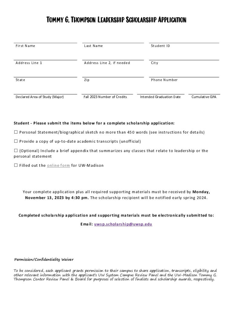 20232024Tommy G. Thompson Leadership Scholarship Instructions and Application Description of Award The Tommy G. Thompson Center on Public Leadership offers scholarships to undergraduate students at