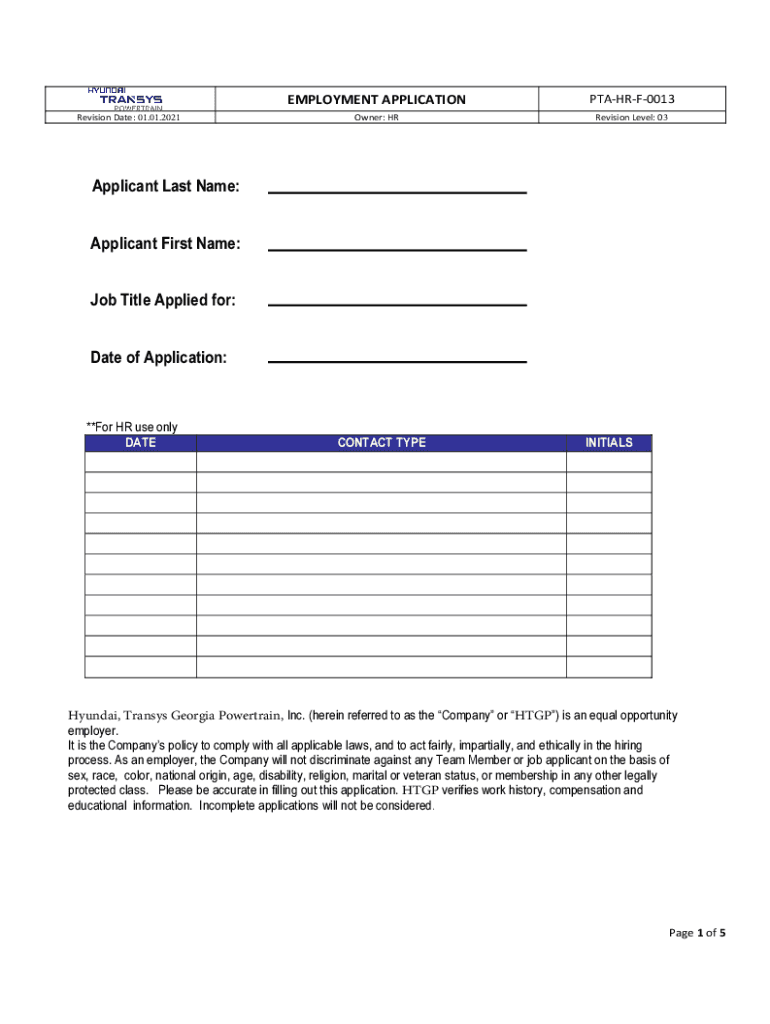 Revision Date: 01.01.2021EMPLOYMENT APPLICATIONPTAHRF0013Owner: Revision Level: 03Applicant Last Name: