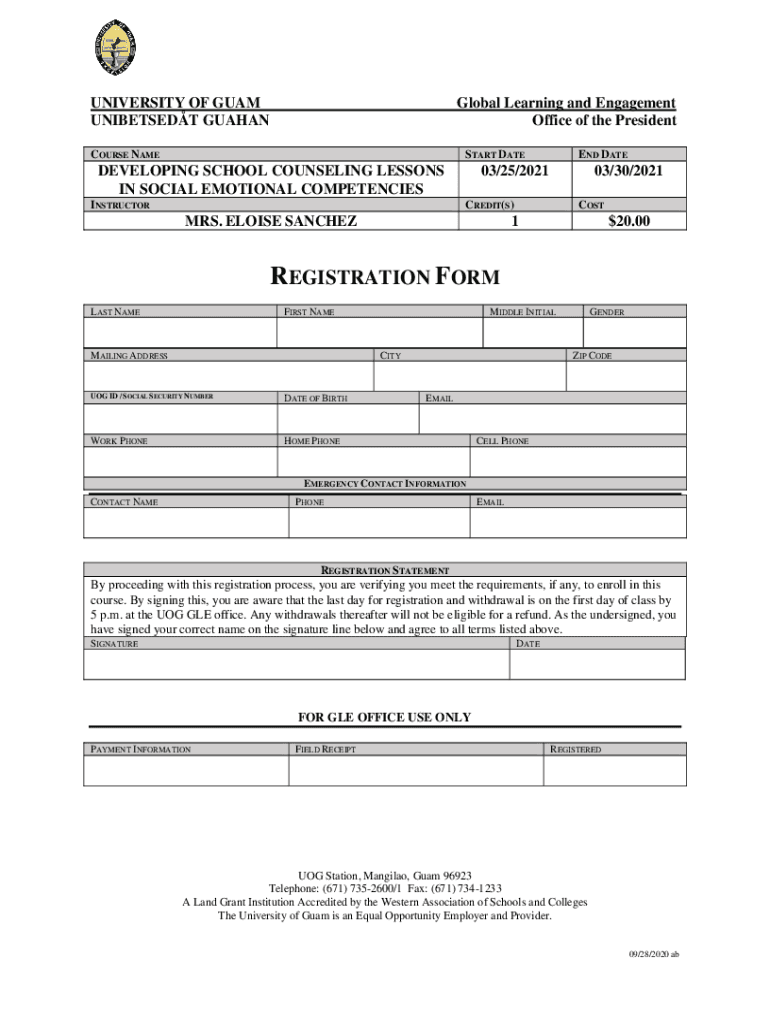UNIVERSITY OF GUAM UNIBETSEDT GUAHANGlobal Learning and Engagement Office of the PresidentCOURSE NAMESTART DATEDEVELOPING SCHOOL COUNSELING LESSONS IN SOCIAL EMOTIONAL COMPETENCIES INSTRUCTOREND DATE03/25/202103/30/2021CREDIT(S)MRS.