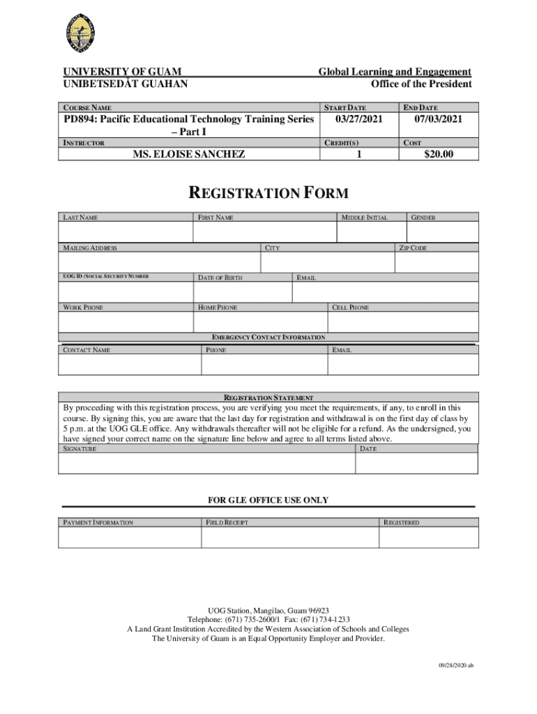 UNIVERSITY OF GUAM UNIBETSEDT GUAHANGlobal Learning and Engagement Office of the PresidentCOURSE NAMESTART DATEPD894: Pacific Educational Technology Training Series Part I INSTRUCTOREND DATE03/27/202107/03/2021CREDIT(S)MS.