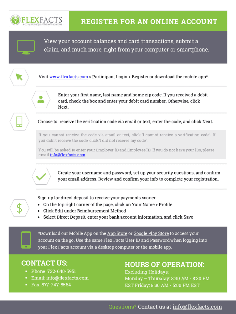 REGISTER FOR AN ONLINE ACCOUNT View your account balances and card transactions, submit a claim, and much more, right from your computer or smartphone.Visit www.flexfacts.com Participant Login Register