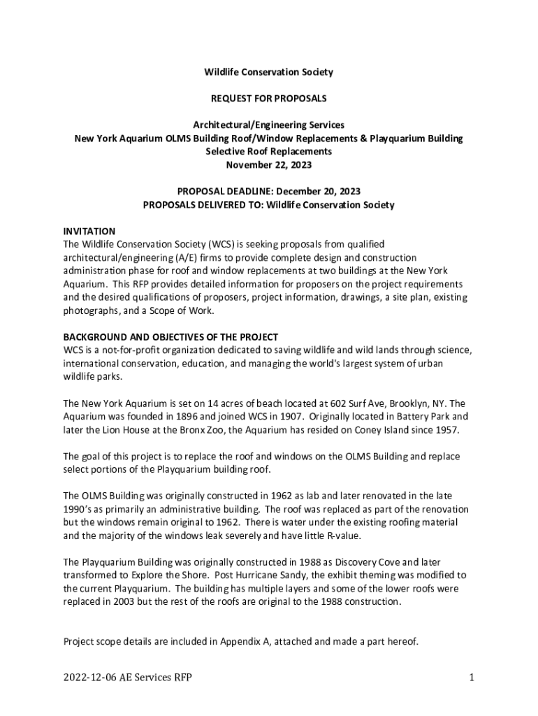 Wildlife Conservation Society REQUEST FOR PROPOSALS Architectural/Engineering Services New York Aquarium ALMS Building Roof/Window Replacements & Aquarium Building Selective Roof Replacements November