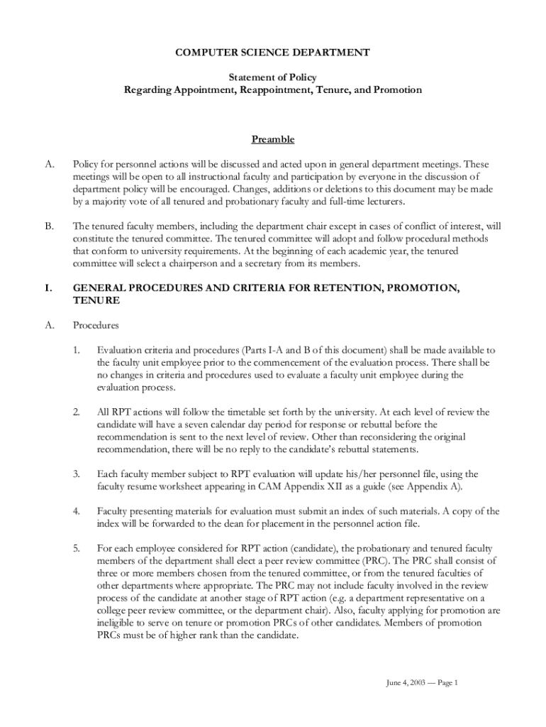 COMPUTER SCIENCE DEPARTMENTStatement of PolicyRegarding Appointment, Reappointment, Tenure, and PromotionPreambleA. Policy for personnel actions will be discussed and acted upon in general department