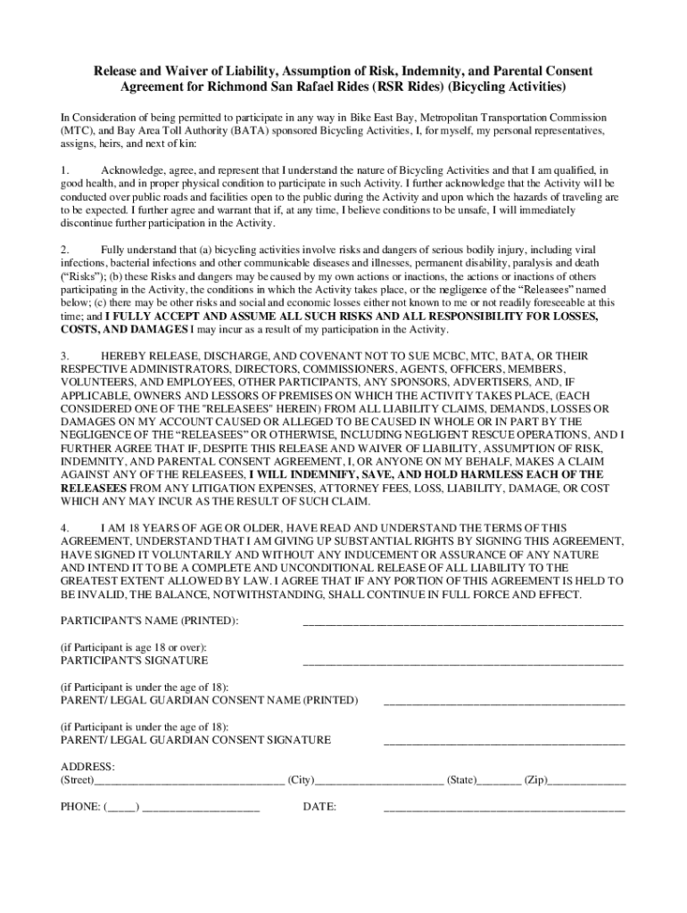 Get the free Release, Liability Waiver, Assumption of Risk - mtc ca