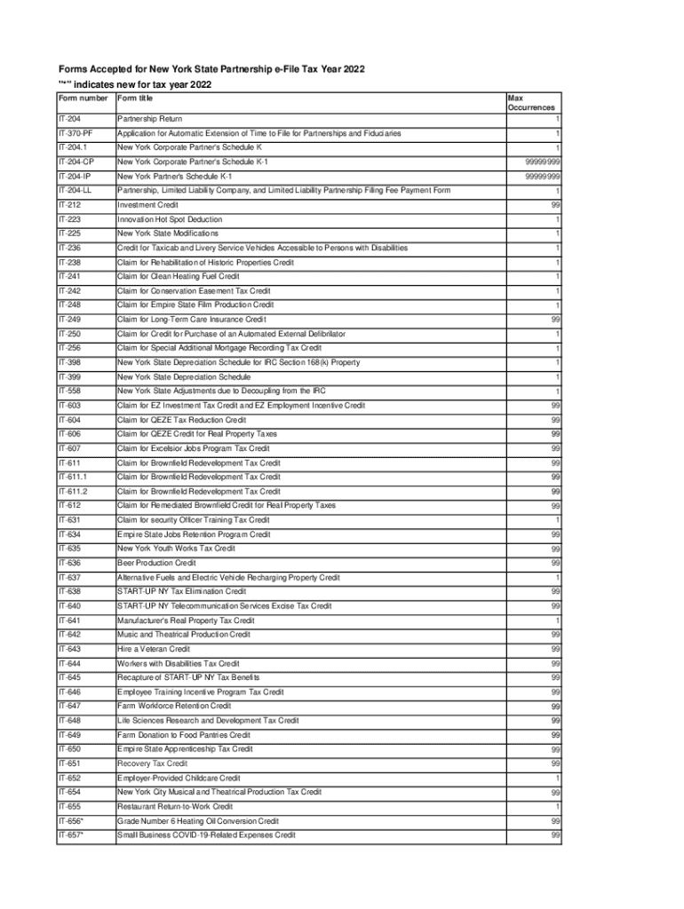 Forms Accepted for New York State Partnership file Tax Year 2022