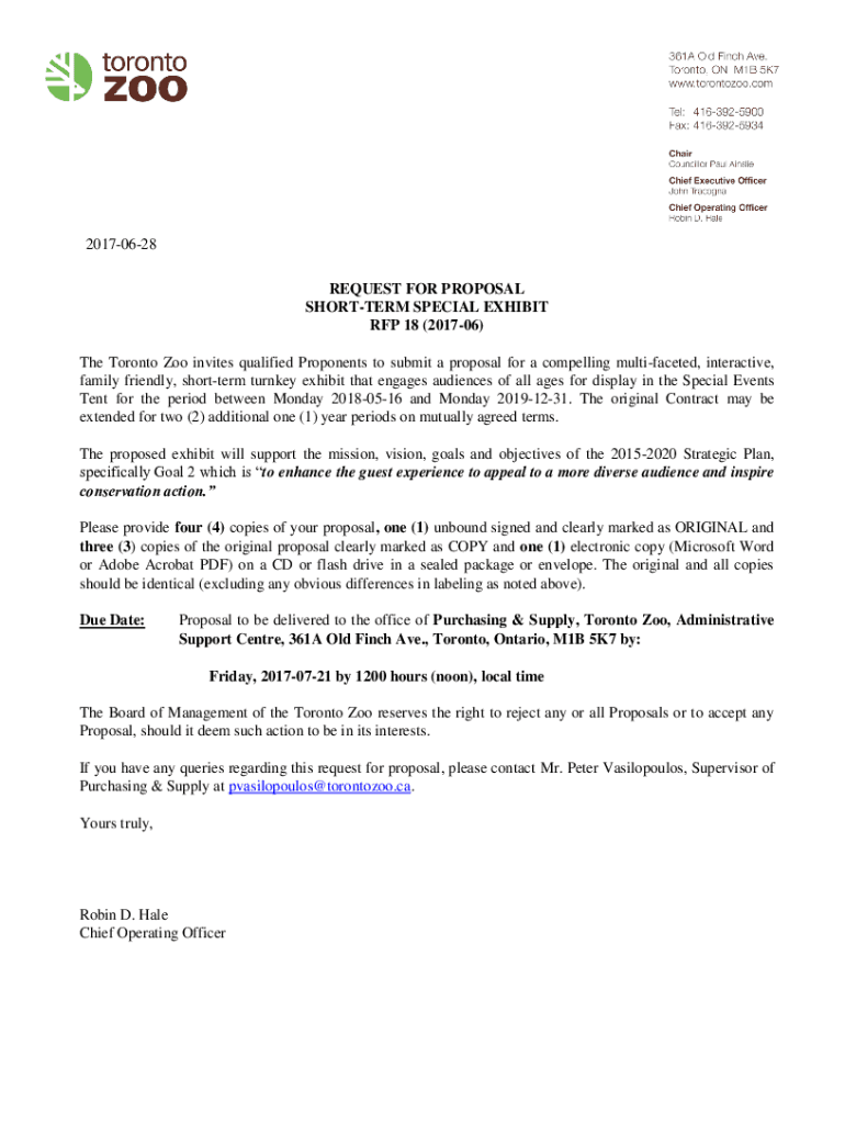 Vendors or service providers who wish to participate in the bidding process for projects or services related to the Toronto Zoo are required to file an RFP.