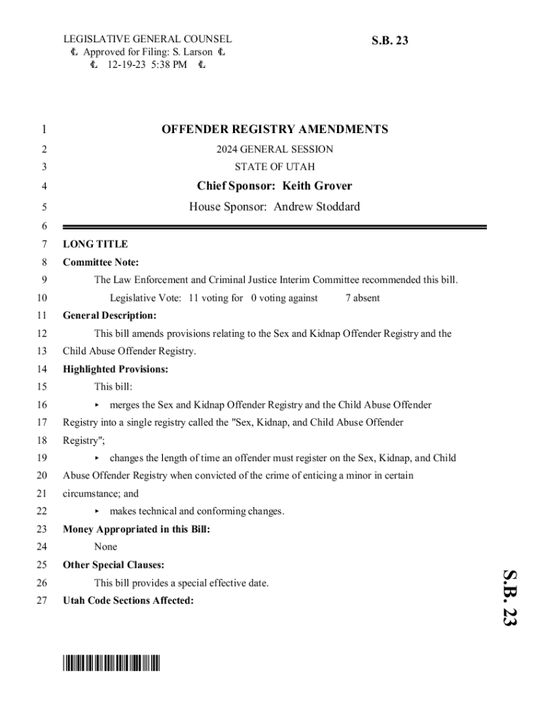 6 121923 5:38 PM 6S. B. 231OFFENDER REGISTRY AMENDMENTS22024 GENERAL SESSION3STATE OF UTAH4Chief Sponsor: Keith Grover5House Sponsor: