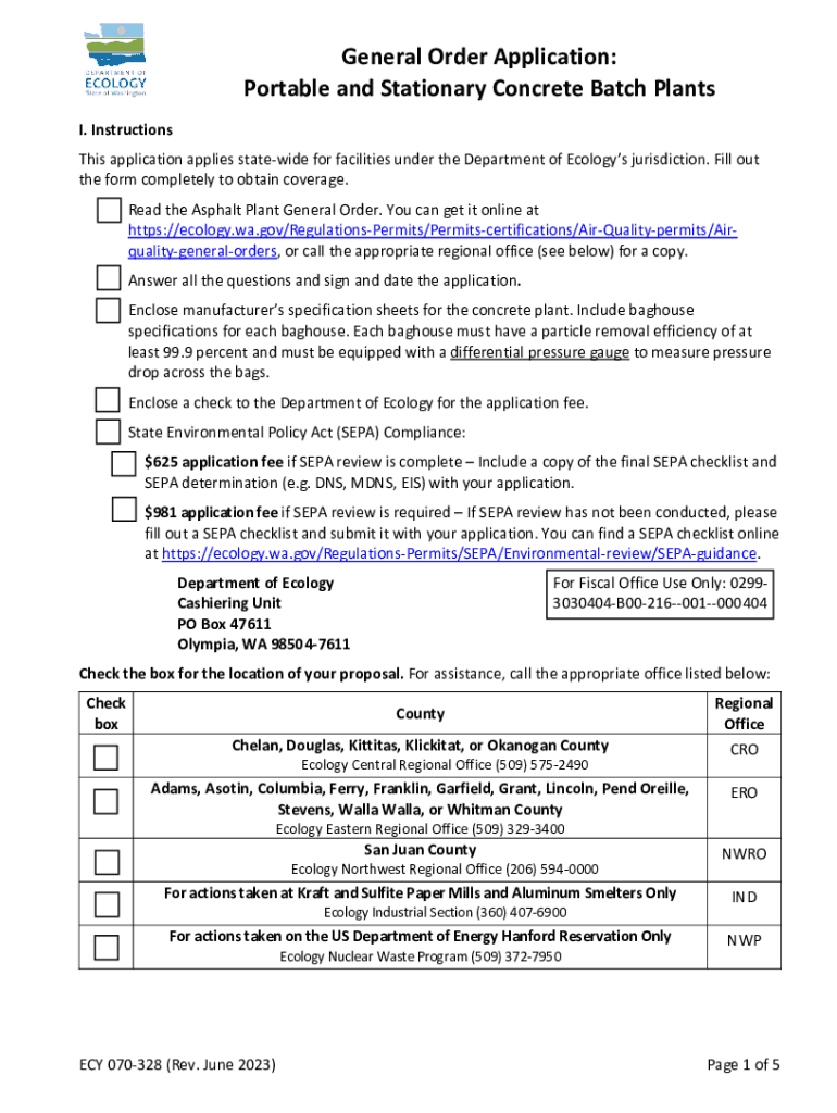 General Order Application: Portable and Stationary Concrete Batch Plants I. Instructions This application applies statewide for facilities under the Department of Ecology jurisdiction. Fill out the