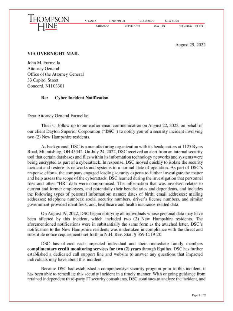 Re:Cyber Incident NotificationDear Attorney General Formerly: