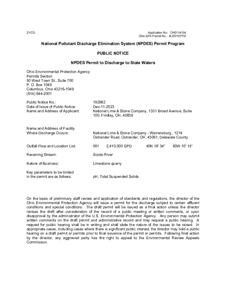 Ohio EPA Permit No.: 4IJ00103×FDNational Pollutant Discharge Elimination System (NODES) Permit Program