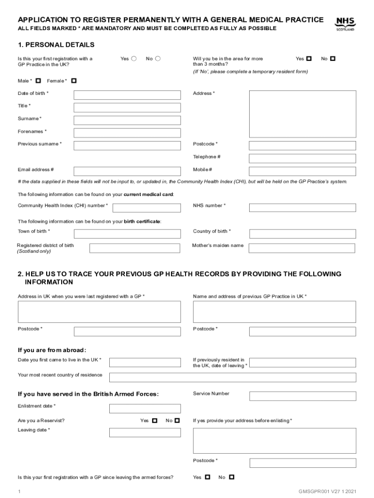 APPLICATION TO REGISTER PERMANENTLY WITH A GENERAL MEDICAL PRACTICE ALL FIELDS MARKED * ARE MANDATORY AND MUST BE COMPLETED AS FULLY AS POSSIBLE1. PERSONAL DETAILS Is this your first registration