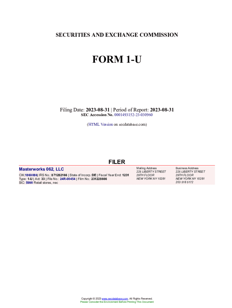 Get the free Masterworks 062, LLC Form 1-U Filed 2023-08-31. Accession Number