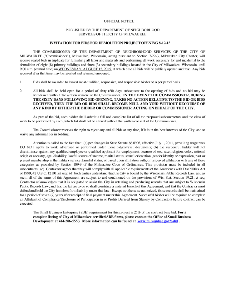 OFFICIAL NOTICE PUBLISHED BY THE DEPARTMENT OF NEIGHBORHOOD SERVICES OF THE CITY OF MILWAUKEE INVITATION FOR BIDS FOR DEMOLITION PROJECT OPENING 81215 THE COMMISSIONER OF THE DEPARTMENT OF NEIGHBORHOOD