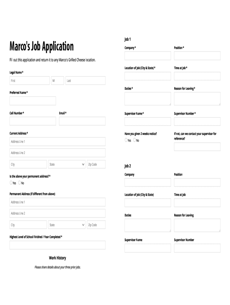 Job 1Marco\'s Job ApplicationCompany *Position *Location of Job (City & State) *Time at Job *Duties *Reason for Leaving *Supervisor Name *Supervisor Number *Have you given 2 weeks notice? If not,