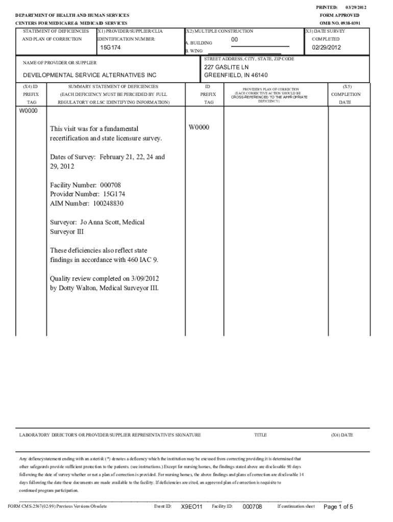 PRINTED: DEPARTMENT OF HEALTH AND HUMAN SERVICES CENTERS FOR MEDICARE & MEDICAID SERVICES STATEMENT OF DEFICIENCIES(X1) PROVIDER/SUPPLIER/LIGAND PLAN OF CORRECTIONIDENTIFICATION NUMBER:15G17403/29/2012FORM