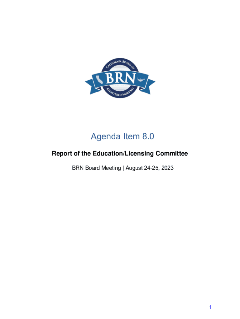 Agenda Item 8.0 Report of the Education/Licensing Committee BRN Board Meeting | August 2425, 20231Education/Licensing Committee August 24 25, 2023 Table of Contents 8.1Discussion and possible action
