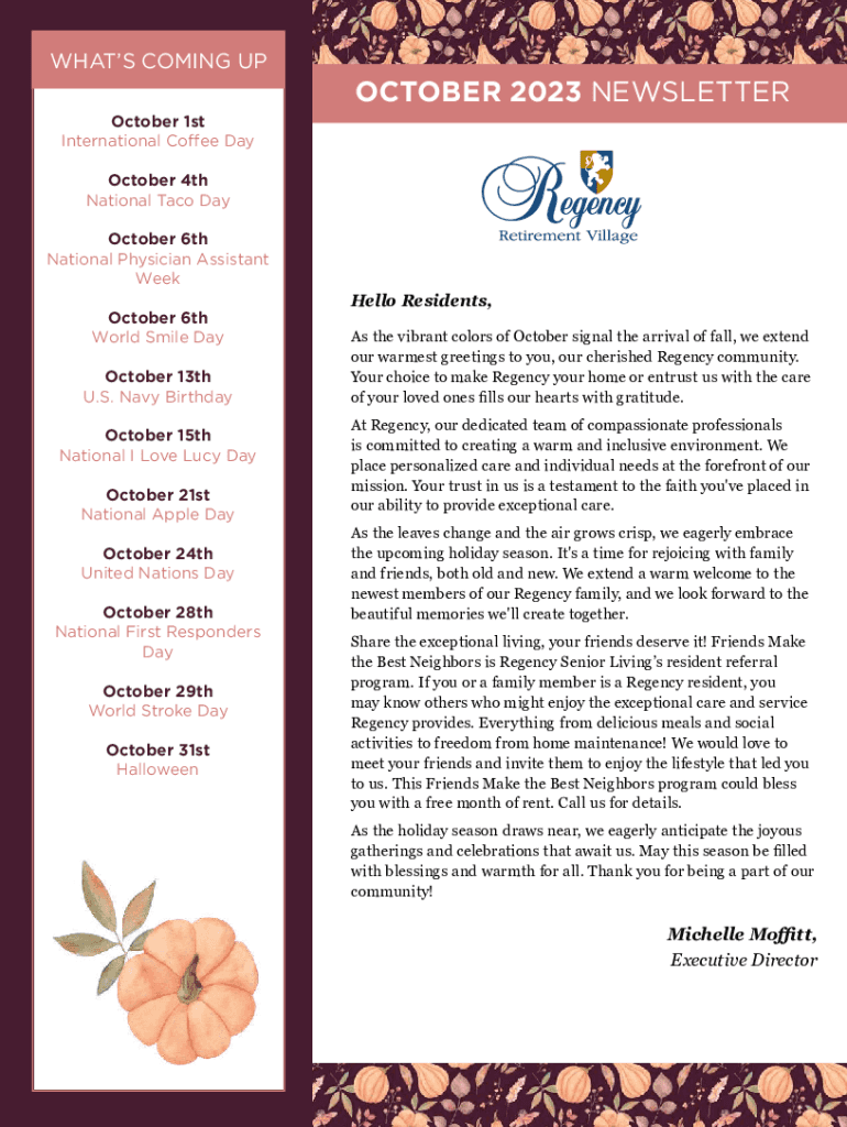 WHAT'S COMING OCTOBER 2023 NEWSLETTER October 1st International Coffee Day October 4th National Taco Day October 6th National Physician Assistant Week October 6th World Smile Day October 13th U.S.