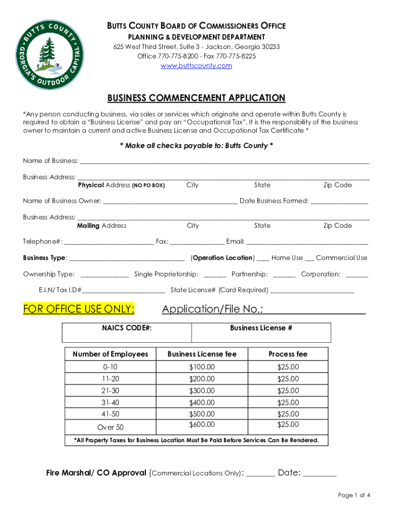 BUTTS COUNTY BOARD OF COMMISSIONERS OFFICE PLANNING & DEVELOPMENT DEPARTMENT 625 West Third Street, Suite 3 Jackson, Georgia 30233 Office 7707758200 Fax 7707758225 www.buttscounty.comBUSINESS COMMENCEMENT