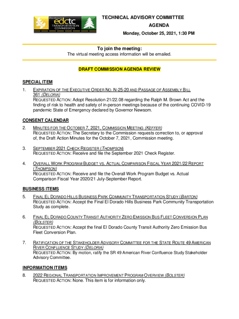 TECHNICAL ADVISORY COMMITTEE AGENDA Monday, October 25, 2021, 1:30 PTO join the meeting: The virtual meeting access information will be emailed. DRAFT COMMISSION AGENDA REVIEW SPECIAL ITEM 1.EXPIRATION