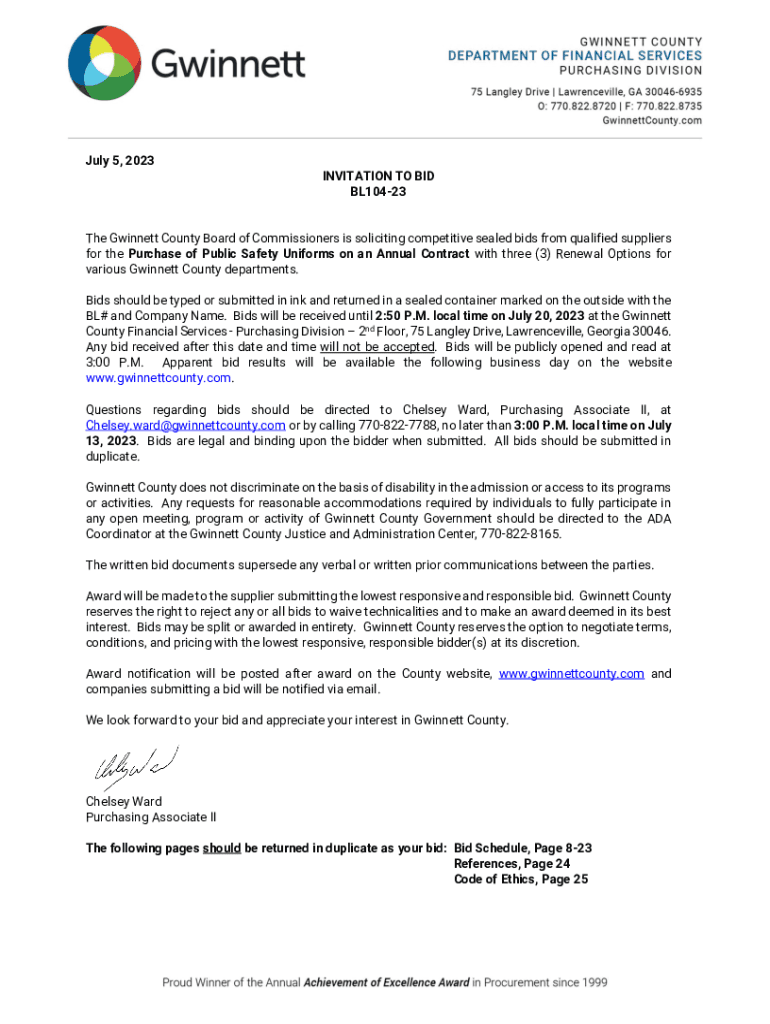 July 5, 2023, INVITATION TO BID BL10423 The Gwinnett County Board of Commissioners is soliciting competitive sealed bids from qualified suppliers for the Purchase of Public Safety Uniforms on an Annual