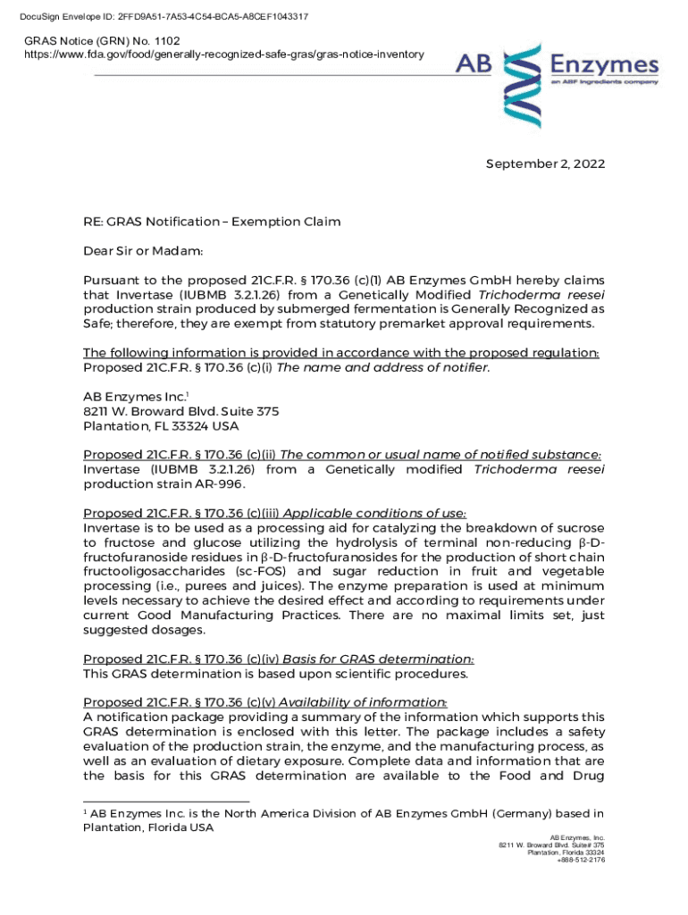 https://www.fda.gov/food/generallyrecognizedsafegras/grasnoticeinventorySeptember 2, 2022RE: GAS Notification Exemption