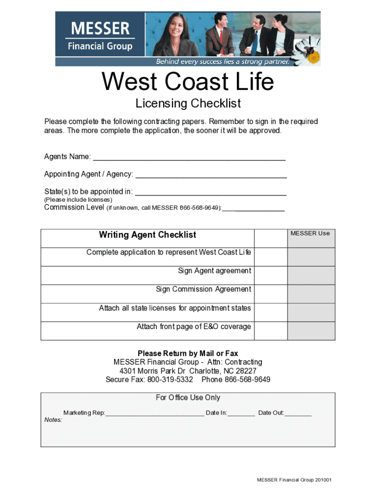 West Coast Life Licensing Checklist Please complete the following contracting papers. Remember to sign in the required areas. The more complete the application, the sooner it will be approved.Agents