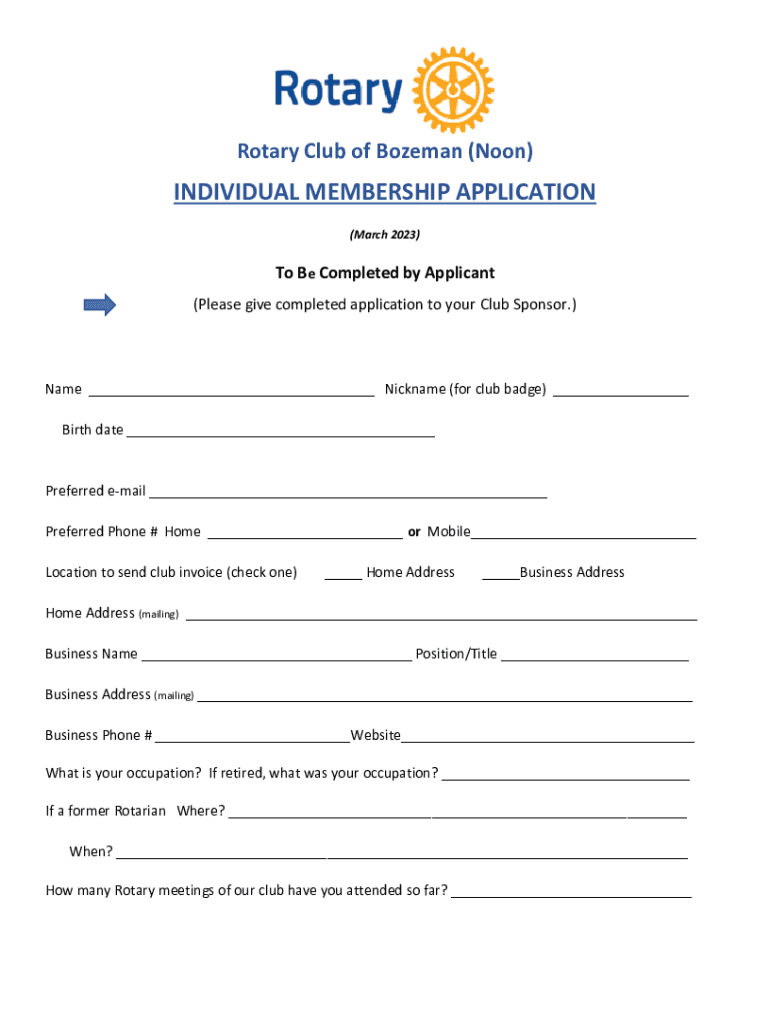 Rotary Club of Bozeman (Noon)INDIVIDUAL MEMBERSHIP APPLICATION (March 2023)To Be Completed by Applicant (Please give completed application to your Club Sponsor.) Name ___ Nickname (for club badge)